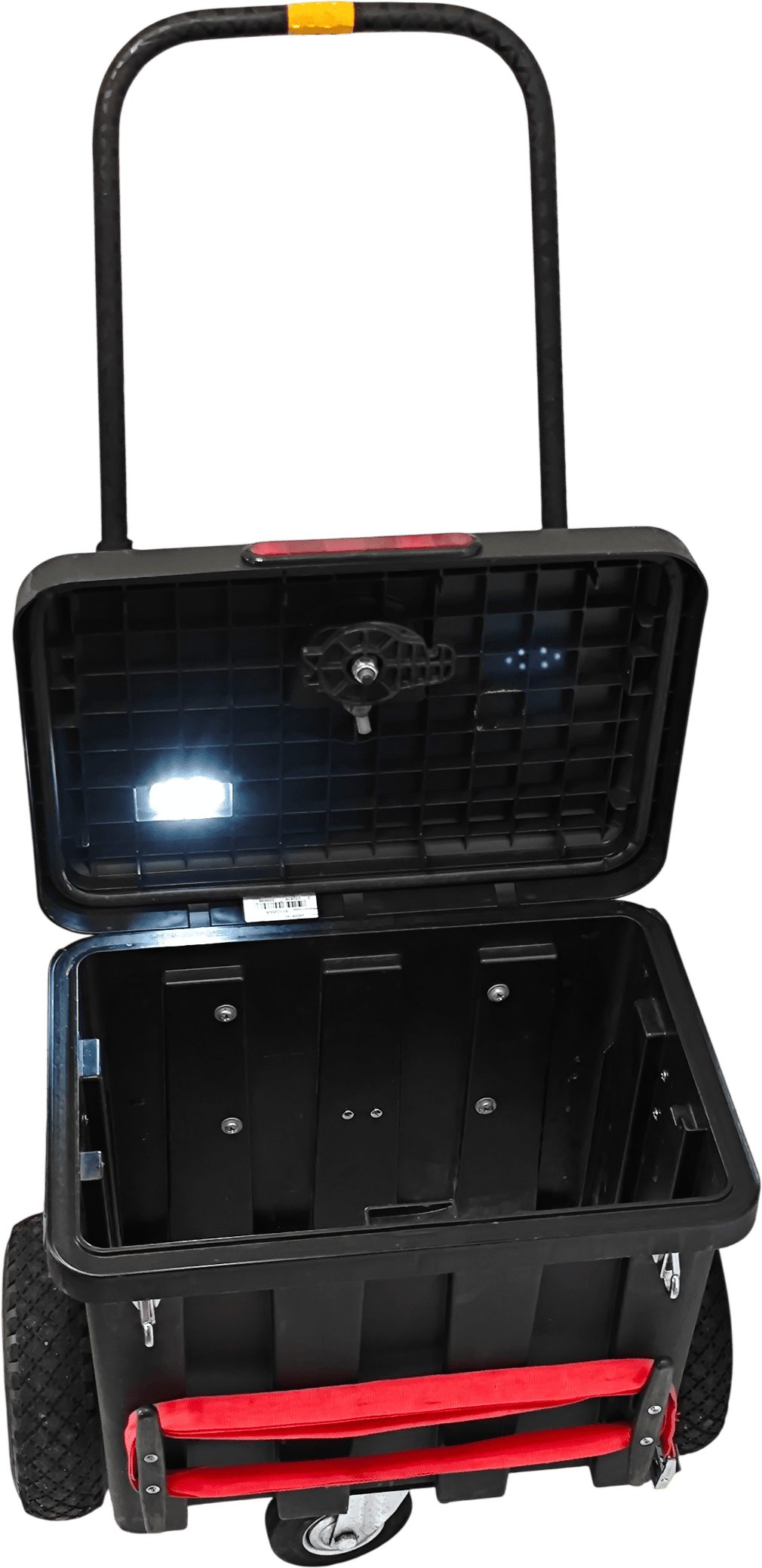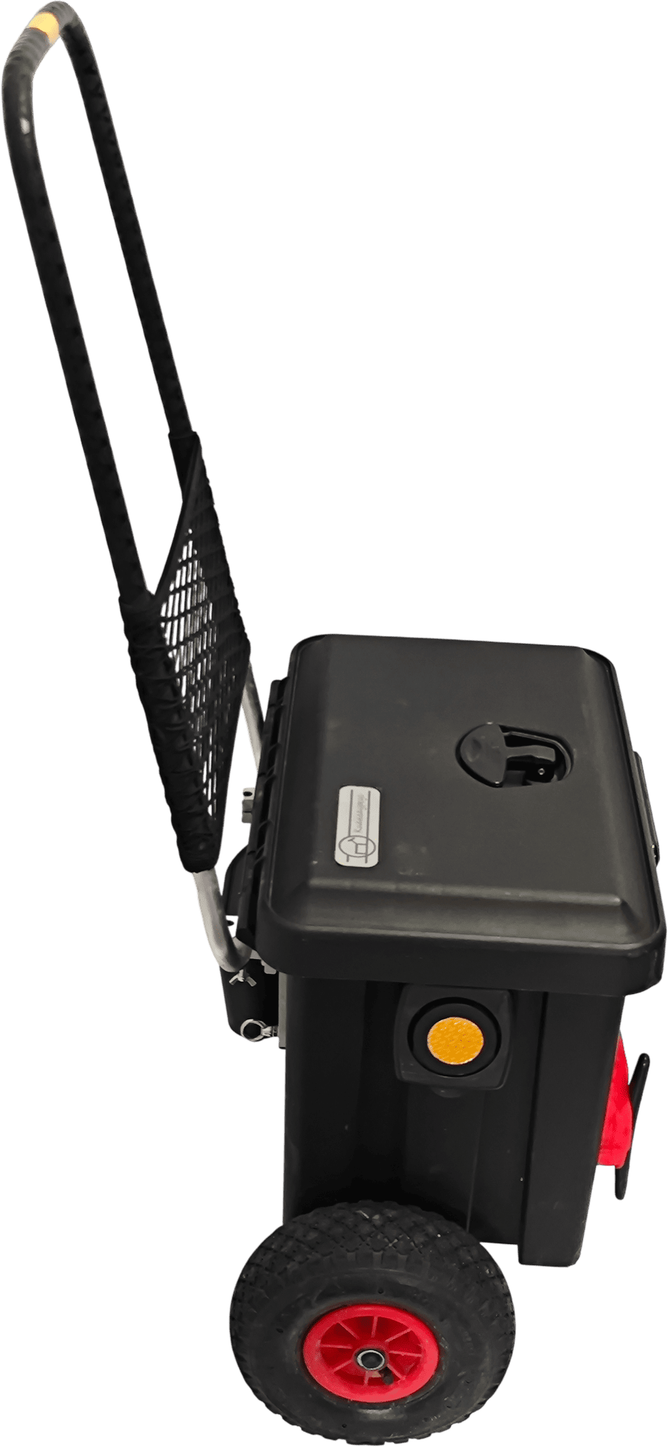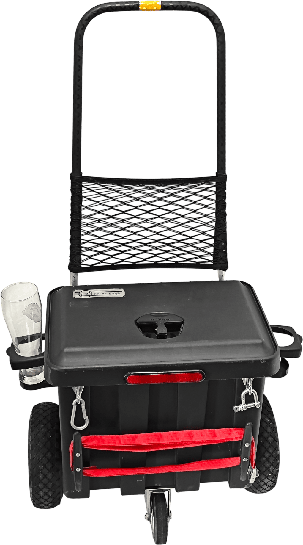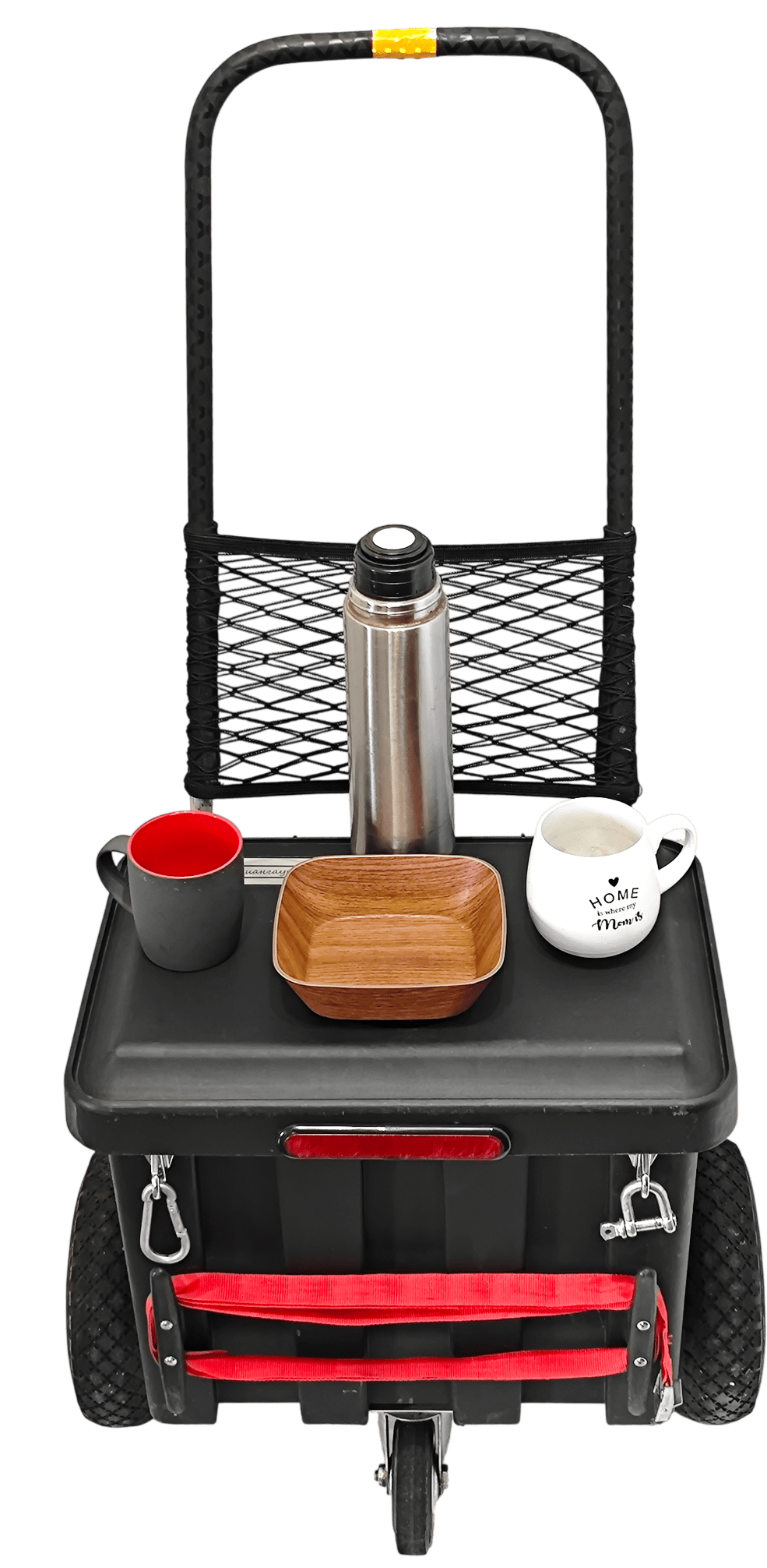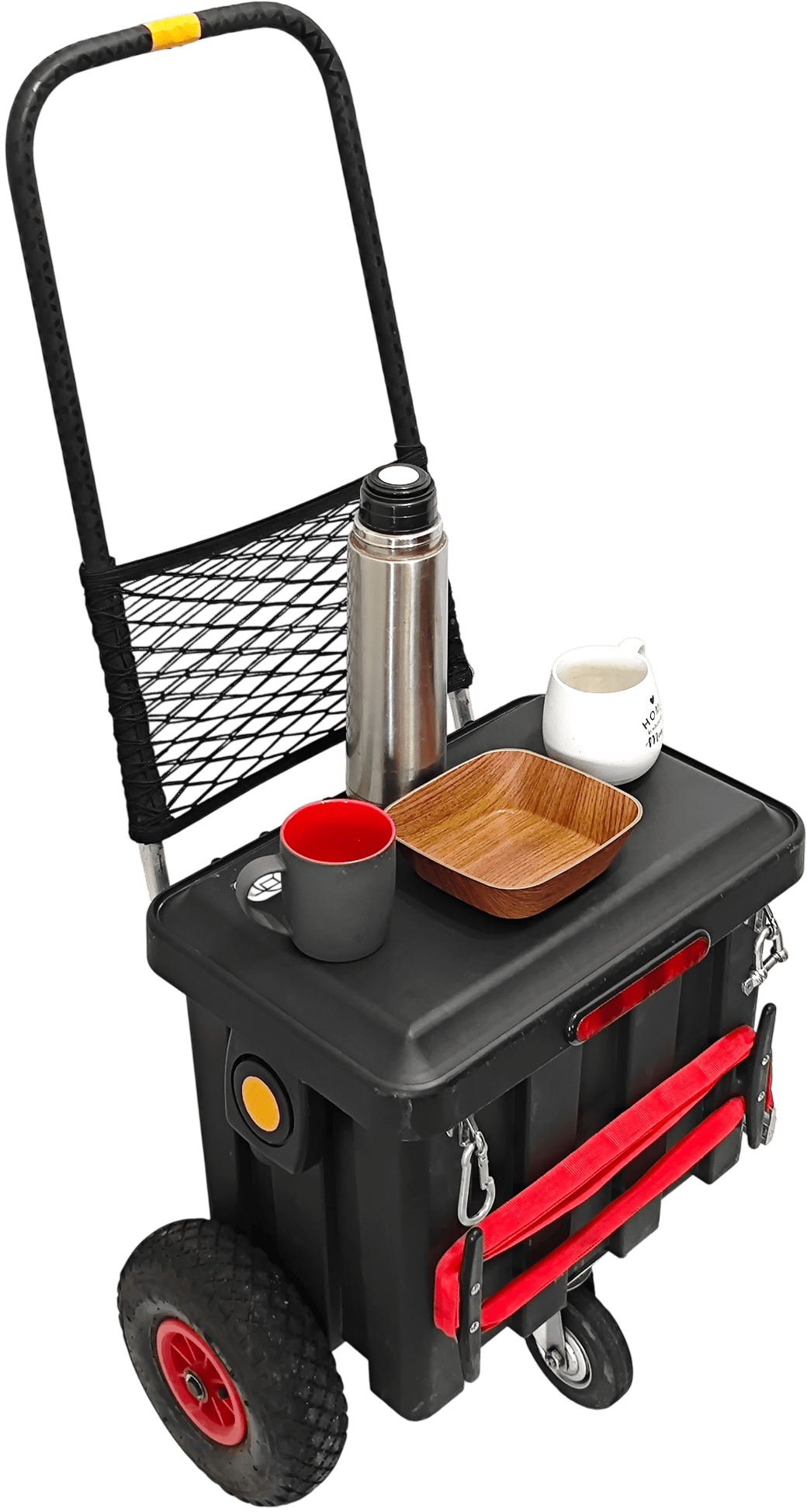 Тележка представляет несущий ящик с герметично закрывающейся на ключ крышкой и оснащена двумя подстаканиками и сеткой для мелочей. У тележки есть поворотная ручка которая меняет угол наклона и фиксируется в заданном положении за счёт трения в узле кронштейна дердащего ручку тележки. Задавая определённый угол наклона ручки тележки при транспортеровке груза достигается перемещения центра масс ближе к оси тележки и как следствие снижается тянущие усилие на кисть руки. Руча тележки крепится к ящику на винтах через промежуточные рапределяющие нагрузку кронштейны. Ручка тележки снимается по средствам откручивания четырёх винтов.